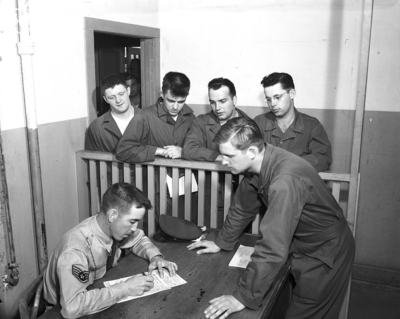 At the Carswell Air Base basic center at Eagle Mountain Lake, Staff Sergeant Elvis R. Jones of Dublin, seated, checks clothing records for, left to right, Private Paul M. Fay of Oak Park, Illinois; Private Marvin A. Engel of Chicago, Private officer John Corvino of Chicago, Private Howard Envy of Naperville, Illinois, and Private officer Ronald Drago of DeKalb, Illinois. Published in Fort Worth Star-Telegram morning edition, April 1, 1951.