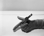 The novel instrument designed for the heart valve operation being performed in Fort Worth is shown on the hand of a surgeon as if in readiness for the operation. Published in Fort Worth Star-Telegram evening edition April 7, 1951.