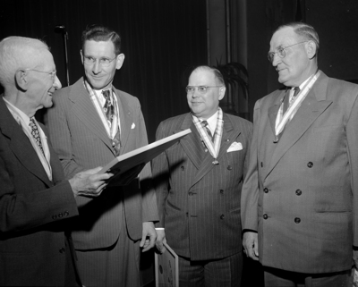 A. L. Shuman, left, presented Silver Beaver awards to three outstanding adult Boy Scout leaders at the annual Longhorn Council banquet. Receiving the awards, left to right, were Vernon Hoaldridge, Tome Demarest and J. Van Renfro. Published in Fort Worth Star-Telegram, evening edition March 29, 1951.