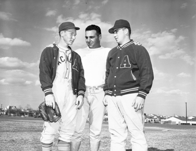Arlington Heights High School Baseball Coach Nick Ruggieri gives final instructions to Pitchers James Baggett, left, and Bob Miller, right, prior to first games in District 5-AA chase. Published in Fort Worth Star-Telegram evening edition March 4, 1951.