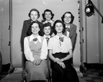 Hostesses for a formal dance at Meadowbrook County Club were, left to right, front row, Barbara Sharp, Barbara Howie, Margaret Johnson, and left to right, back, Diane McNiel, Emelea Hinz and Janie Jones. More than 200 of their school friends attended. Published in Fort Worth Star-Telegram morning edition, April 2, 1951.