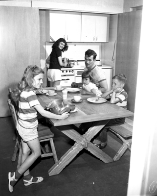 Mrs. Jim Rawls of 1605 Robinhood Drive prepares breakfast with complete modern equipment in one of the new camp cabins for her husband, Candy, Ronny and Sherry. Published in Fort Worth Star-Telegram morning edition, April 1, 1951.
