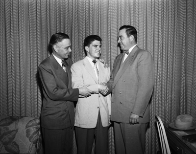 C. R. Pressly Jr., president of the Cosmopolitan Club, greets Bob Utke, 18, center, and his father, G. P. Utke, Milwaukee, Wisconsin, International Cosmopolitan president. Utke has taken his son to Cosmopolitan conventions since the youth was 5-years-old. Published in Fort Worth Star-Telegram morning edition, March 30, 1951. Three men wearing suits and shaking hands.