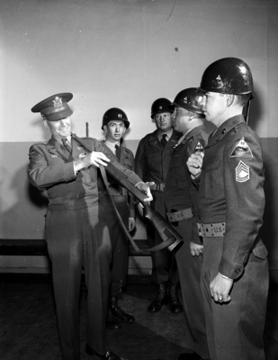 Colonel Edmund J. Lilly Jr., 4th Army inspecting officer, squints down the barrel of Master Sergeant Albert J. Johnson's carbine at inspection of Headquarters and Service Company of the 145th Armored Infantry Battalion. Behind him is Captain Joe H. Peel, company commander, and Major J. Edwin McKee, acting battalion commander. Beside Johnson is Sergeant first class Theodore W. Myatt, who is battalion sergeant major. Published in Fort Worth Star-Telegram morning edition, March 30, 1951. A group of men in Army uniforms. One man has a rifle pointed at himself.