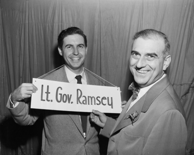 Lieutenant Governor Ramsey, right, is shown with his Gridiron show impersonator, Warren Agee, Texas Christian University professor. Published in Fort Worth Star-Telegram evening edition, March 31, 1951. Two men shaking hands and one man is wearing a sign in front of him.
