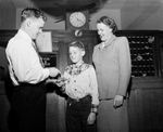Billy Stripling, a charter member of the day camp at Amon Carter Youth Men Christian Association (YMCA), takes out the first resident camp membership in the YMCA's 1951 round-up, which opened. Raymond Suggs, camp director, makes the enrollment as Billy's mother, Mrs. W. K. Stripling Jr., looks on. Billy is a member of the Longhorns Gray-Y club on the West Side. Published in Fort Worth Star-Telegram morning edition, April 2, 1951.