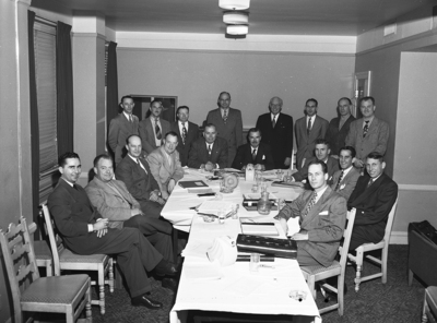 Gathered in a conference room here at the start of a three-day meeting of American Airlines system superintendents of flight and assistants were, from left to right at the table, J. S. Anderson, assistant at Tulsa, Oklahoma; H. L. Clark, New York; F. R. Bailey, Chicago; A. H. Schlanser, assistant at Chicago; W. H. Dunn, New York, superintendent of flying for the system; W. W. Braznell, New York, director of flight for the system; D. G. Ogden, Fort Worth; R. A. Fagin, Los Angeles; T. M. Meldin, assistant at Los Angeles, and T. H. Gibson, assistant at Nashville, Tennessee. Standing, from left to right, are D. Little, New York, supervisor of airway aids; Al Dewitt, New York, assistant regional superintendent of flight; S. P. Bitner, Memphis, assistant regional superintendent; S. Nuckols, Fort Worth, assistant regional superintendent; W. P. McFail, Fort Worth, southern regional director; T. Copeland, New York, of CAA first region; F. Pledsoe, New York, assistant regional superintendent; and R. Pickering, New York, assistant regional superintendent.