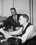 Chief Sheriff's Deputy A. B. Carter, foreground, remained on the job after undergoing three indictments for demanding illegal fees. With him is Attorney Clifford Mays, who posted three $1,000 bonds for the former sheriff. Published in Fort Worth Star-Telegram morning edition, March 31, 1951.