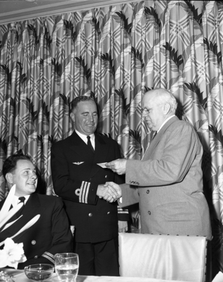 Commander Horacio Bogarin, left, chief of Uruguay's naval aviation, is shown receiving Fort Worth's honorary citizenship award from Mayor Deen, right, for leading the 8,000-mile flight of 10 torpedo bombers to Montevideo