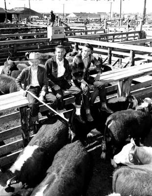 Among visitors at the Fort Worth Stockyards watching calves from Cottie and King Counties go through the market were, left to right, Van Earl Bradford, Guthrie 4-H boy; M. J. Carmichael, Paducah vocational agriculture teacher, and Kenneth Buckley of Swearingen. Bradford had the reserve champion and Buckley the grand champion of the Cottie-King junior stock show at Paducah. Published in Fort Worth Star-Telegram morning edition, April 3, 1951.