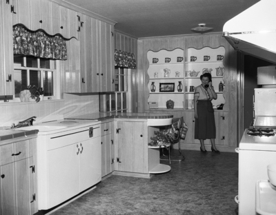 The kitchen in the new home of Mr. and Mrs. William C. Carter, 3245 Stadium Drive, has walls of oak panels in natural finish. Mrs. Carter is shown at the telephone on front of the China cabinet. An electric sink is at left under the window. Published in Fort Worth Star-Telegram morning edition April 8, 1951.
