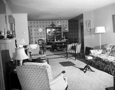 The picture shows the combination living-dining room in the home of Mr. and Mrs. William C. Carter, 3245 Stadium Drive. One wall is papered and the others textured. Rose beige carpeting is used. French doors in the dining area lead to all purpose room. Published in Fort Worth Star-Telegram morning edition April 8, 1951.