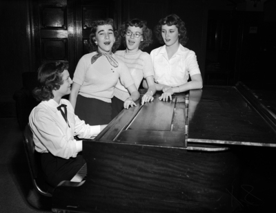 Littlefield high School girls cluster around the piano to harmonize at the Texas Music Educators convention. Charlotte Doss, 14, is the pianist, and the vocalists are, from left to right, Barbara Bryan, 17, Wynema Johnson, 16, and Joyce Tharp, 14.