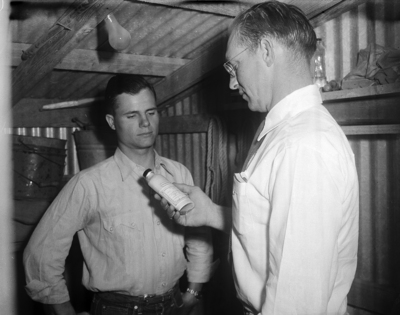 Ballinger Vocational Agricultural Teacher H. B. Edmonson, right, talks over a problem in livestock medicine with Weldon Lange, who is feeling calves, lambs and ewes. Published in Fort Worth Star-Telegram July 1951.