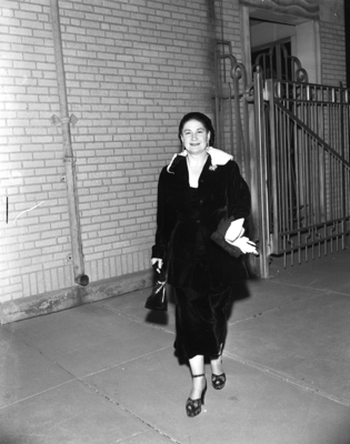 Hurrying to "Catch" the ballet of "The Girl of the Golden West", which will be presented by the Civic Opera Association, is Norene Thrash Coates, dancing teacher. A woman standing up wearing a suit. She is smiling and holding a purse in left hand and her right hand on her right hip. Published in Fort Worth Star-Telegram morning edition, March 6, 1951.