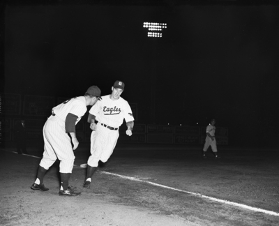 Manager L. D. Meyer welcomes home Jim Fridley after his blast over left-field fence with mate aboard in exhibition game with Cats at Dallas. Published in Fort Worth Star-Telegram evening edition, March 6, 1951. Man is running in a baseball uniforms and another man standing with bent knees facing him. Published in Fort Worth Star-Telegram evening edition, March 6, 1951.