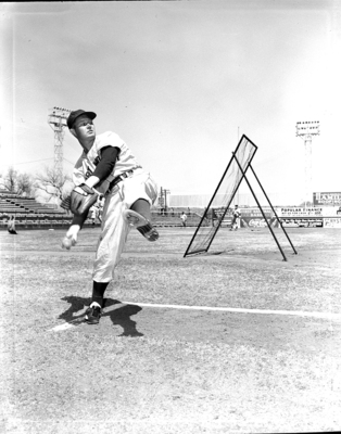 Joe (Red) Bielemeier, 24-year-old Oregonian who has been trying to pitch for the Cats for five years, finally has "arrived". He'll open season for them at Oklahoma City, also will pitch in the exhibition at Dallas. A Baseball player in throwing position with a baseball and mat on hand. Published in Fort Worth Star-Telegram evening edition, March 5, 1951.