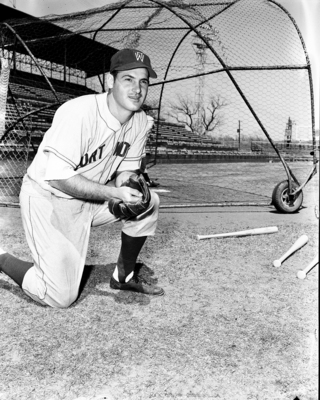 George Freese, former football star, is leading for Cats' third-base job. He batted.285 last year at Elmira, New York. A man wearing a left baseball glove on his right hand and his left hand inside the glove holding something in it. He is on one knee and smiling in his baseball uniform. Published in Fort Worth Star-Telegram morning edition, March 6, 1951.