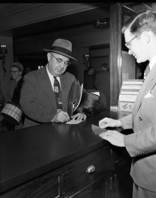 Dr. Frank Simon, of Cincinnati, Ohio, cornet player and composer seen registering at the front desk at TMEA.
