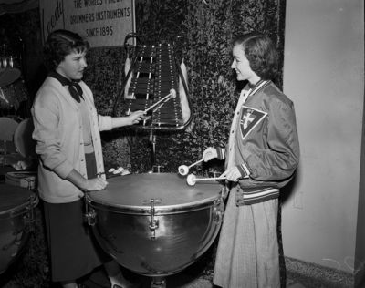 Beatrice Heath, of Mineral Wells, and Norma Jean Taylor, also of Mineral Wells. Both attend Mineral Wells High School and can be seen here trying out marimba and timpani.