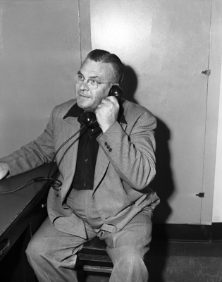 Image of Crowley's new mayor, J. H. (chick) Race, he is shown on the phone with a Fort Worth auto parts man, seeing new conveniences for his home town. Published in Fort Worth Star-Telegram evening edition April 10, 1951.