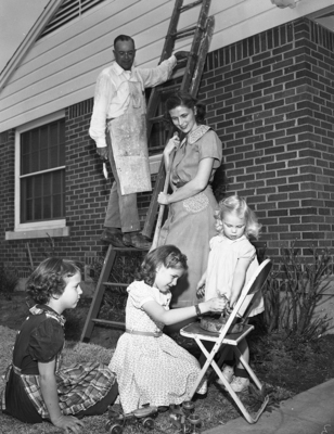W. F. MacDermott, 3405 Hilltop, pauses on a "paint up" job while he and Mrs. Ed L. Parris, 3414 Hilltop, look on nostalgically at the making of mud pies. The pie makers, left to right, are Annette McFadden, Linda and Peggy Parris. Published in Fort Worth Star-Telegram morning edition April 15, 1951.
