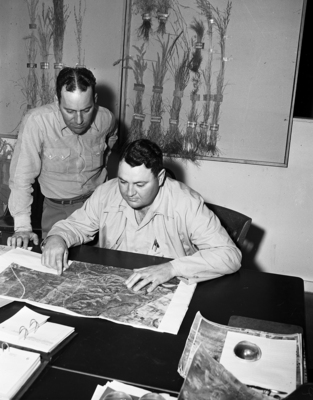 Image shows Olen Cornelius, left, PMA administrative officer and Allen V. Shepard, Soil Conservation Service, discussing conservation work at Robert Lee. Published in the Fort Worth Star-Telegram May 1951.