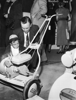 C. J. Long and son, Danny, 5, of 3617 Stadium, admire a power mower. Published in Fort Worth Star-Telegram evening edition April 9, 1951.