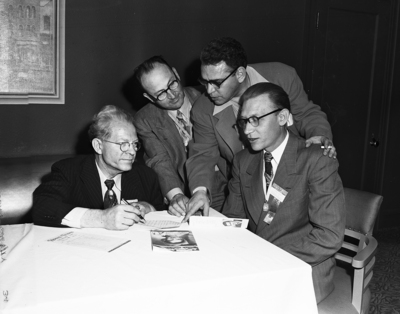 Delegates to the 24th convention of Southwestern Photographers Association, Inc. talk over plans for the three-day session at Hotel Texas. Shown left to right, are C. A. Taylor of Fort Worth; Mel Thurman, Abilene; Buddy Shrader, Little rock, Arkansas; and W. Jack Rodden of Roswell, New Mexico. Rodden is president of the Association. Published in Fort Worth Star-Telegram morning edition April 9, 1951.