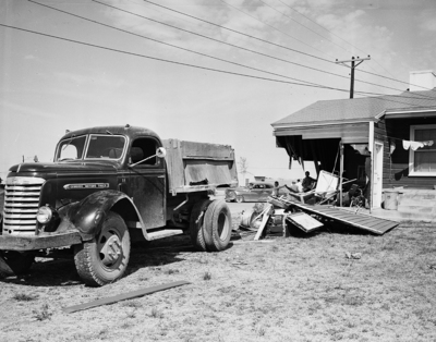 Scattered boards and other debris remain to show what was the corner of a garage at 4300 Scurry owned by C. J. Stovall. The truck at left, driven by Walter L. Clark, 27, of 803 W. Bluff, plunged into the structure after it was in a collision with an auto at Scurry and Seminary Drive. Mrs. Elizabeth Drake, 85, of 1440 Spurgeon, was injured in the auto crash. Published in Fort Worth Star-Telegram morning edition April 10, 1951.
