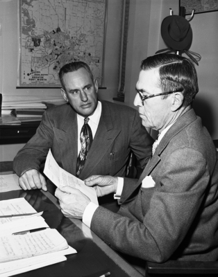 Police Chief Hawkins, left, hands his resignation as chief of police to City Manager W. O. Jones, asking to be relieved of the grief and responsibilities of the chief's office. Published in Fort Worth Star-Telegram morning edition April 10, 1951.