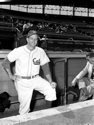 Two veterans among the young Cats are Southpaw Pitcher Ross Grimsley, right, one-time Houston hurler, and Pitcher-Coach Bill McCahan, a returnee from 1950. Houston Hurler doesn't have a negative and Bill McCahan is in the back behind Ross Grimsley. A man standing in the bleachers with a stadium of behind him. Published in Fort Worth Star-Telegram evening edition, April 11, 1951.