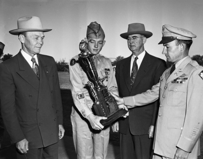 Cadet Major Jimmy Vickery of Polytechnic High School holds the Star-Telegram ROTC rifle team trophy which his school added to its permanent collection upon presentation by Amon Carter Jr. Looking on, left to right, are Poly Principal Thompson, School Superintendent Moor, and Major V. V. Laughlin, professor of Military science and tactics. Published in Fort Worth Star-Telegram morning edition April 11, 1951.