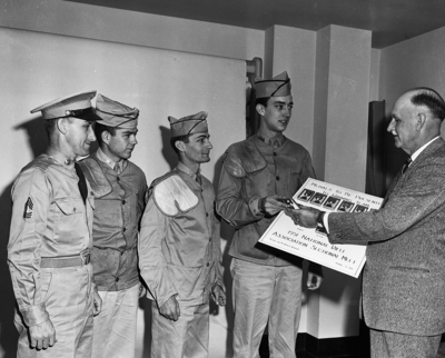 President E. H. Hereford of Arlington State College, right, hands over medals won last week-end when the ASC rifle team earned practically all the awards in the National Rifle Association sectional match at Texas A&M College. shown, left to right, are Master Sargeant Robert T. Van Keuren, coach; Cadets Howard Mims Jr. of Dallas, Joseph C. Buckman of 2217 Chelsea Rd., and Ton Stevenson, 4806 Panola, and President Hereford. Not shown are team members Frank E. Arnold and John J. O'Brien, both of Dallas. Published in Fort Worth Star-Telegram morning edition April 12, 1951.