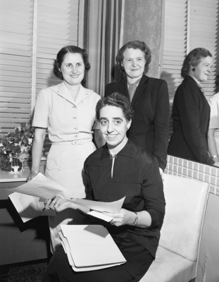 Image shows three participants in the leadership training institute at the Fort Worth Public Library. From left to right, Mrs. Odell Bailey, chairman of the educational department of the Fort Worth Council, Parent Teacher Association (P-TA), Mrs. Oneita Wilson Pierce, district supervisor of homemaking education, Texas State College for Women (TSCW), seated, and Dr. Bernice Milburn Moore, consultant, homemaking education and Hogg Foundation, Austin. Published in the Fort Worth Star-Telegram evening edition, May 3, 1951.