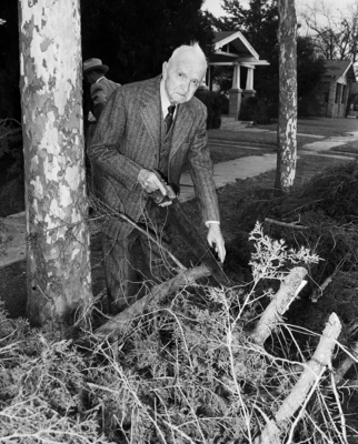Ninety summers haven't slowed down A. J. Mercer, a veteran of the oil and gas industry, shown here sawing a branch cut from one of his shrubs.