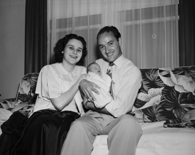 Donna Gene, daughter of Mr. and Mrs. Gene Gregston (He's in senior's sports department), was 11 days old when Photographer Al Panzera and her parents collaborated for this picture. Donna Gene didn't respond to all the acceptable methods for waking babies, so she slept serenely through her first "sitting." She arrived April 2 and soon after had the household under command. Published in Fort Worth Star-Telegram April 1951.