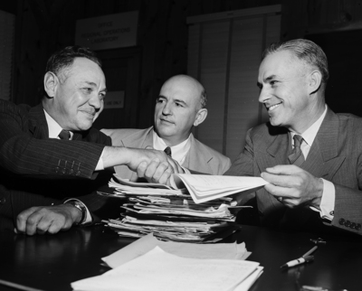 J. Lee Vilbig of Dallas, left, was low bidder at the regional office of the Soil Conservation Service for three detention reservoirs in the East Fork watershed of Trinity River. He was congratulated by Louis P. Merrill, right, regional SCS direction. an interested party was Roland Boyd of McKinney, president of the East Fork Association. Published in Fort Worth Star-Telegram morning edition April 14, 1951.