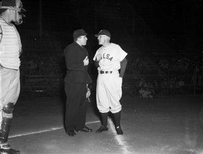 Stormy Al Vincent, manager of the Oilers, has his first hot argument of 1951 season. He is telling off Umpire Ed Cassini, claiming a Fort Worth batsman should have been charged with a strike after a part-swing. Published in Fort Worth Star-Telegram morning edition, April 15, 1951. A man wearing a full black uniform and cap and a man wearing a white baseball uniform and dark cap. Having an angry facial expression conversation.