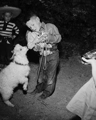 Curley, prize-winning goat in the Children's Museum Pet Show, gets a bit of refreshment from his owner, Larry Reilly, 4801 Stanley. Published in Fort Worth Star-Telegram morning edition April 15, 1951.