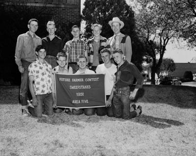 The Celina High School judging team, which won sweepstakes honors at the Area 5 FFA (Future Farmers of America) contest at Arlington State College, displays the victory banner. Shown, left to right, front row, are Ocie Vest, Bobby Parish, Dwayne Morin, Bobby bunch, and Edwin Hayes. Standing, left to right are, Billy Dudley, Lowell Granstaff, Arthur Rucker, Louis Pafford and J. R. McElroy, teacher. Published in Fort Worth Star-Telegram morning edition April 15, 1951.