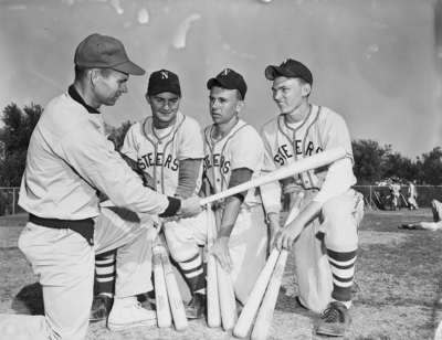 How to hold the bat calls for some firsthand explanation from North Side Coach Lewis Doan (left), who has outfielders Leslie Mattinson, Charles Scogin and Jimmy Nettles for his audience. Published in Fort Worth Star-Telegram morning edition April 22, 1951.