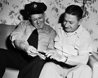 Vernon Seals, left, fireman of 1201 Stella, looks over a childhood picture of 1201 Stella, looks over a childhood picture of his brother, Jim, of Council Bluffs, Iowa. This was the first time the brothers had seen each other since Jim left 21 years ago for the Army. Published in Fort Worth Star-Telegram morning edition April 17, 1951.
