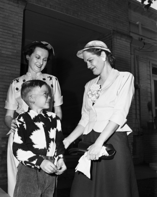 Mrs. W. R. Lamb, left, who was installed as president of the Social Service Section of the Junior Woman's Club at the section's closing luncheon, discussing the Cross-Eyed Clinic with Mrs. Lee Bassinger, new projects chairman. With them is Jimmy Pritchard, one of the clinic's patients. The Cross-Eyed Clinic is the project of the Social Service Section. Published in Fort Worth Star-Telegram evening edition April 18, 1951.