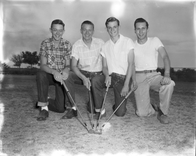 Here's Arlington Heights' golf team which shoots for regional title at Stephenville. Left to right, Tommy Parnell, Everett Roberts, Bryan Honts, and David Welch. Jackets were runners-up in city tournament. The boys are kneeling with golf clubs, smiling.