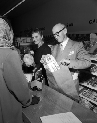 The picture shows how the customer is checked out at Sherman's Super Market. Mrs. Sam A. Nixon is being served by Mrs. Mooney J. Sherman, who is totaling the sale, and her husband is shown sacking the groceries.
