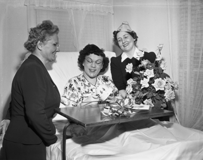 Miss Alberta Lett, former student nurse who is an invalid, receives birthday gifts from two VFW Auxiliary district officials, Mrs. Myrtle Taylor, left, and Mrs. Paul B. Monroe.