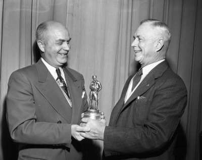 District Judge Dave McGee, right, receives a trophy honoring his leadership as a Boy Scout leader from Julius Bruner, North Star district chairman, during the court of honor.
