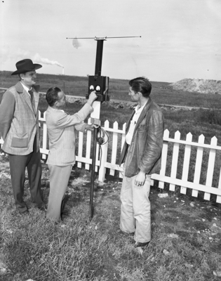 Using a "banjo" radio testing instruments to take the "wiggle" out of airway beams are three Civil Aeronautics Administration (CAA) technicians. Left to right, E. S. Weinman, Harold Illich and M. J. Elrod, testing the instrument landing system glide path beam at Fort Worth Municipal Airport. Published in Fort Worth Star-Telegram evening edition, February 23, 1950.