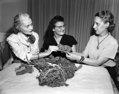 Image shows three members of the Knights Templar, Mrs. Ernest F. Sellars, co-chairmen left, Mrs. Luther R. Swanger, general chairman for the women's activities for the Knights Templar conclave, center and Mrs. Dudley F. Johnson. They are preparing for the Knights Templar conclave, decorating the Keystone Room for luncheon and style show in Hotel Texas. Published in the Fort Worth Star-Telegram morning edition, April 23, 1951.